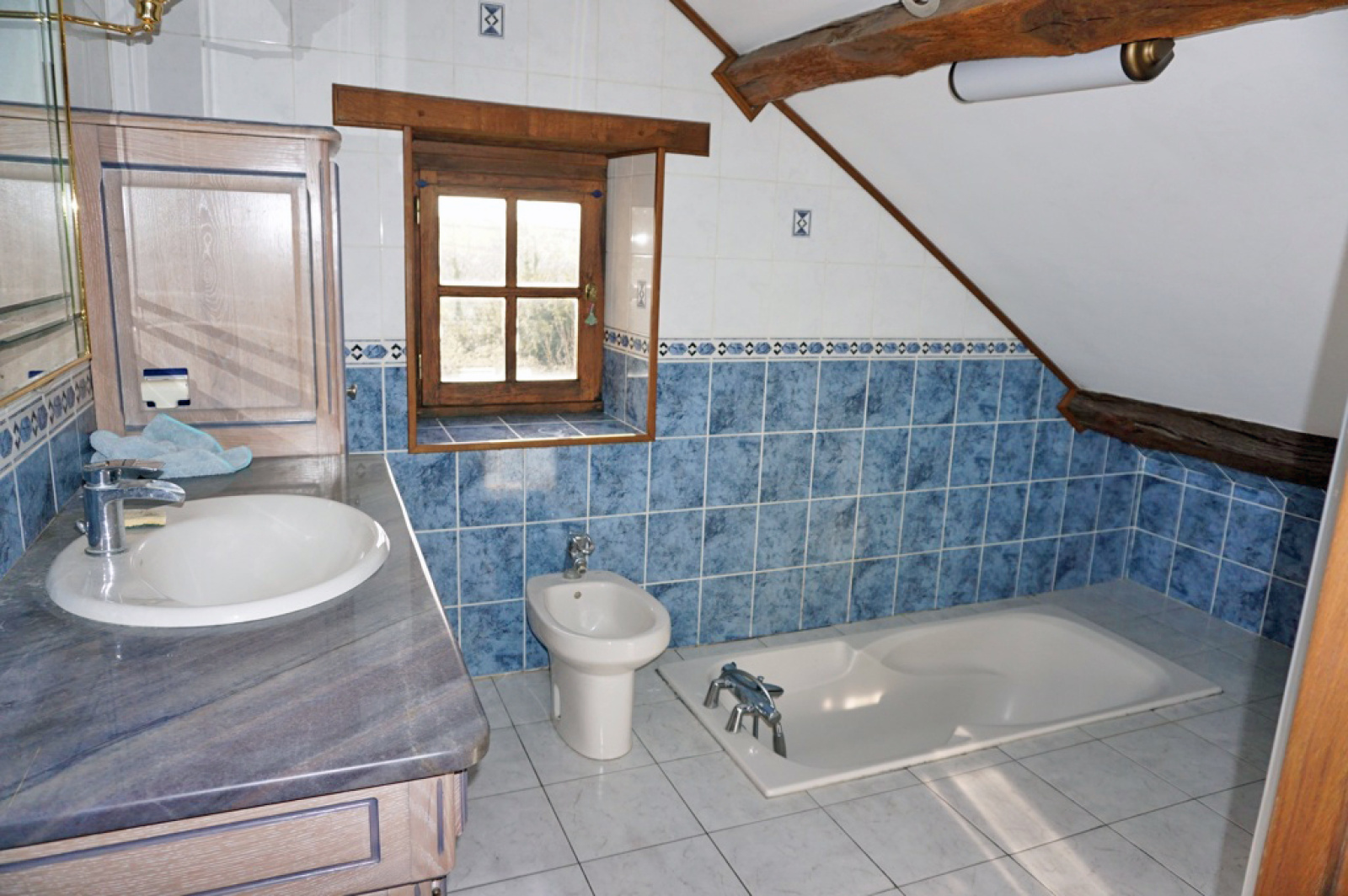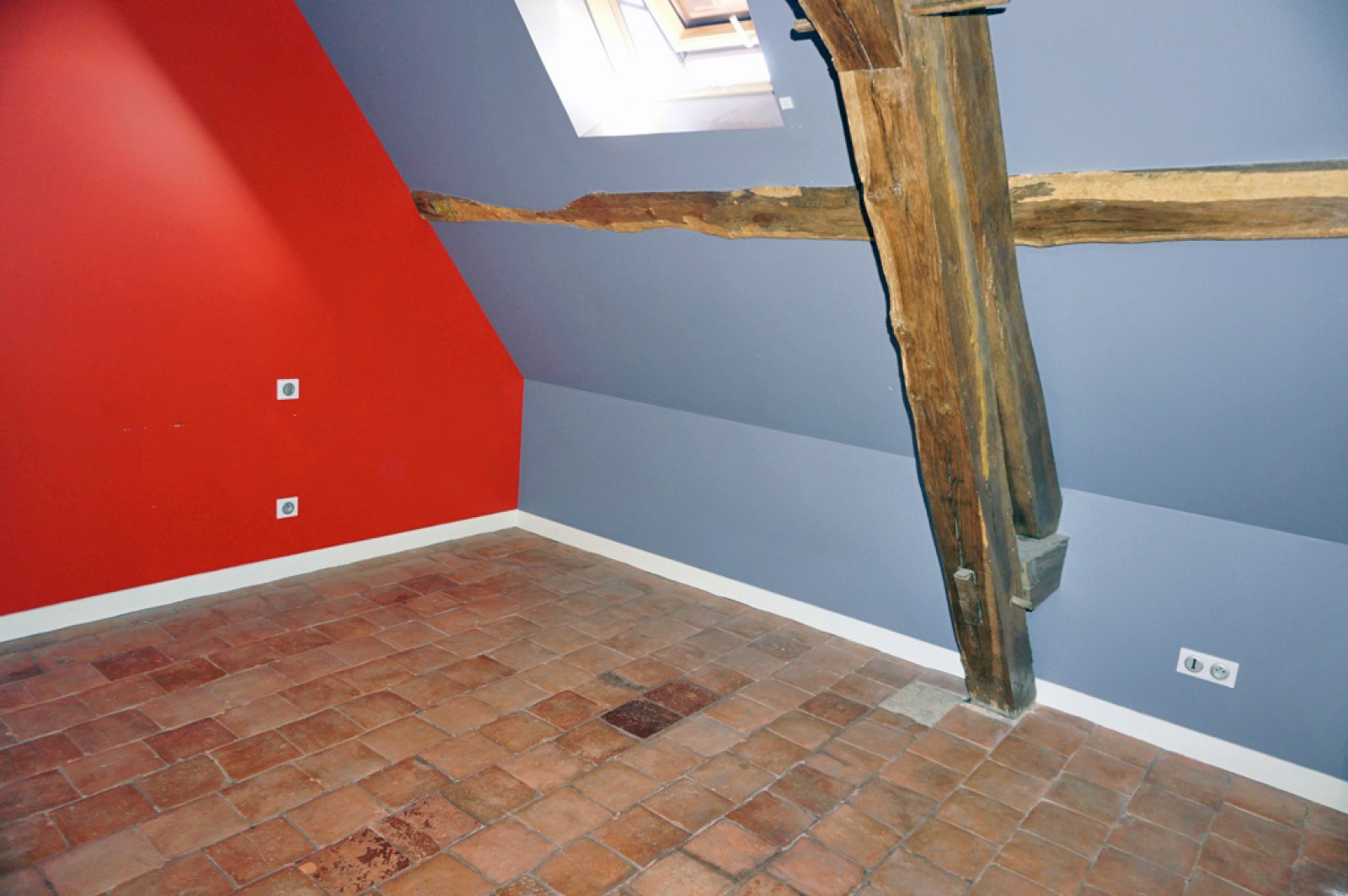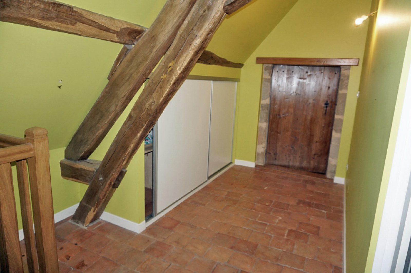 - Au 1er étage : dégagement avec sol en tommettes, deux grandes chambres (34m² et 20m²), salle de bains, wc.