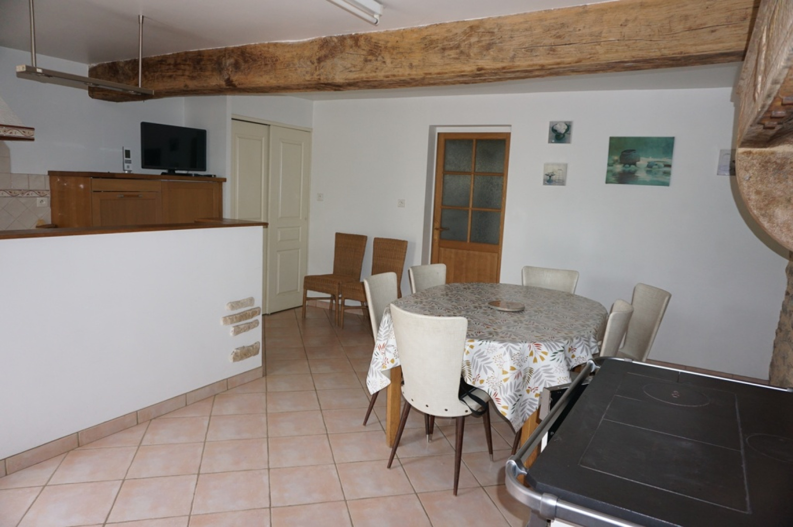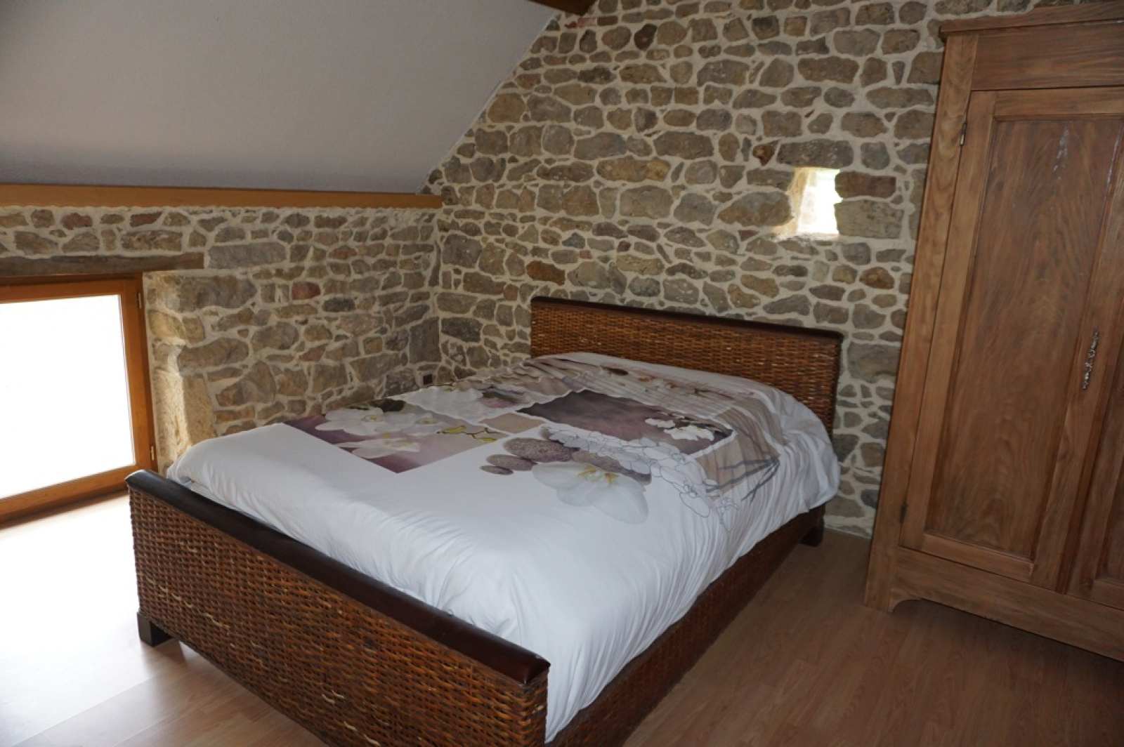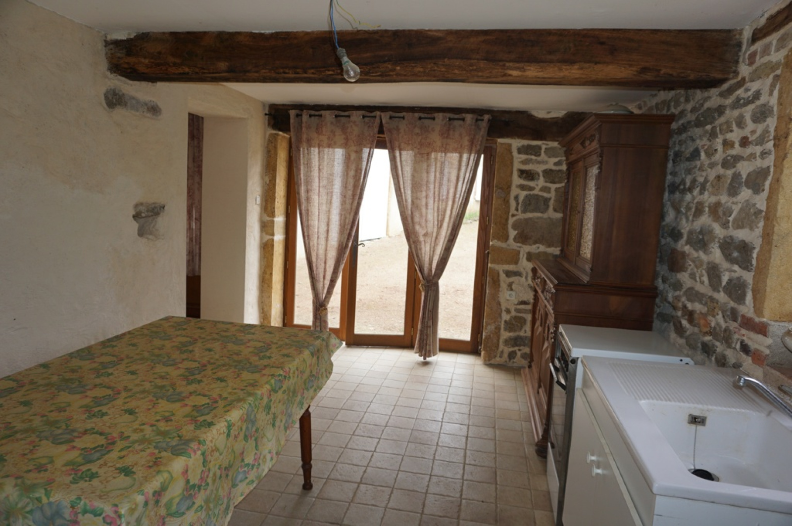 - 2ème maison avec pierres et poutres apparentes : hall d'entrée, cuisne, salle d'eau, wc et à l'étage : deux chambres.